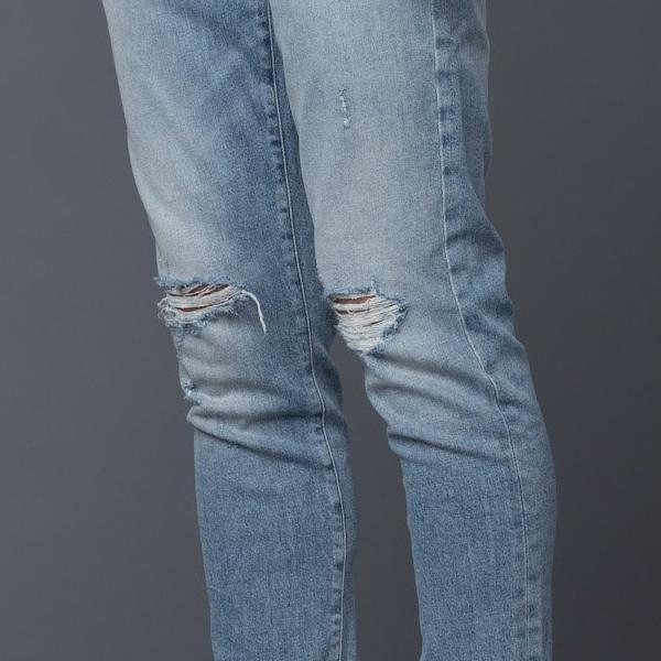 - 5-pocket styling, 4-button fly. Shredded holes at the knees.