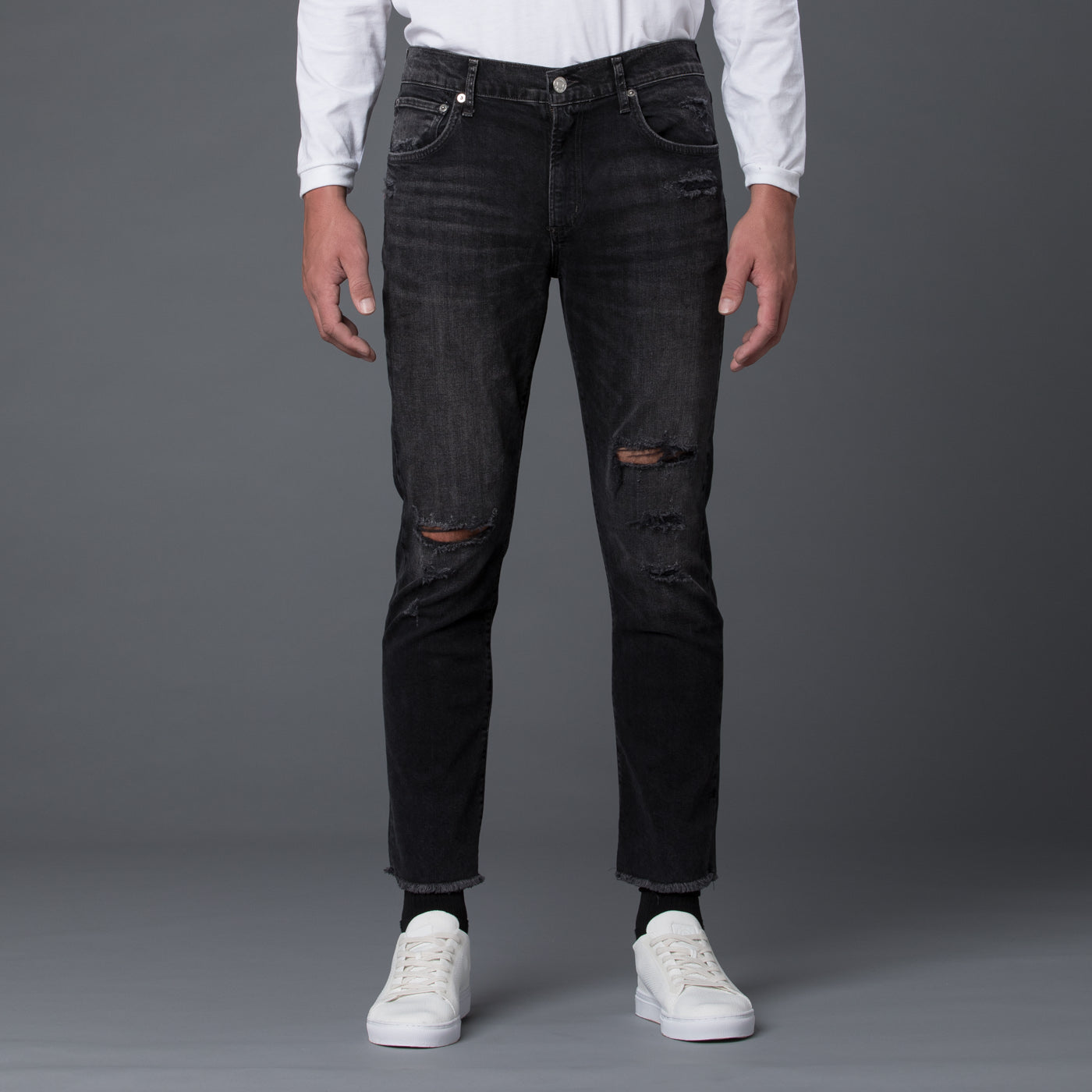 AGOLDE continues to push excellence in the premium denim market with the Blade Jean in Underground Destruct. Designed in a skinny destructed dark grey wash with raw edge hems and a touch of stretch for comfort, this is a part of the brand's eco-friendly and socially conscious "Feel Good" collection, which leverages innovative technologies to create a sustainable end product. Worn with the DEATH TO TENNIS Fiction Tee and FREEMANS SPORTING CLUB Black Cap.
