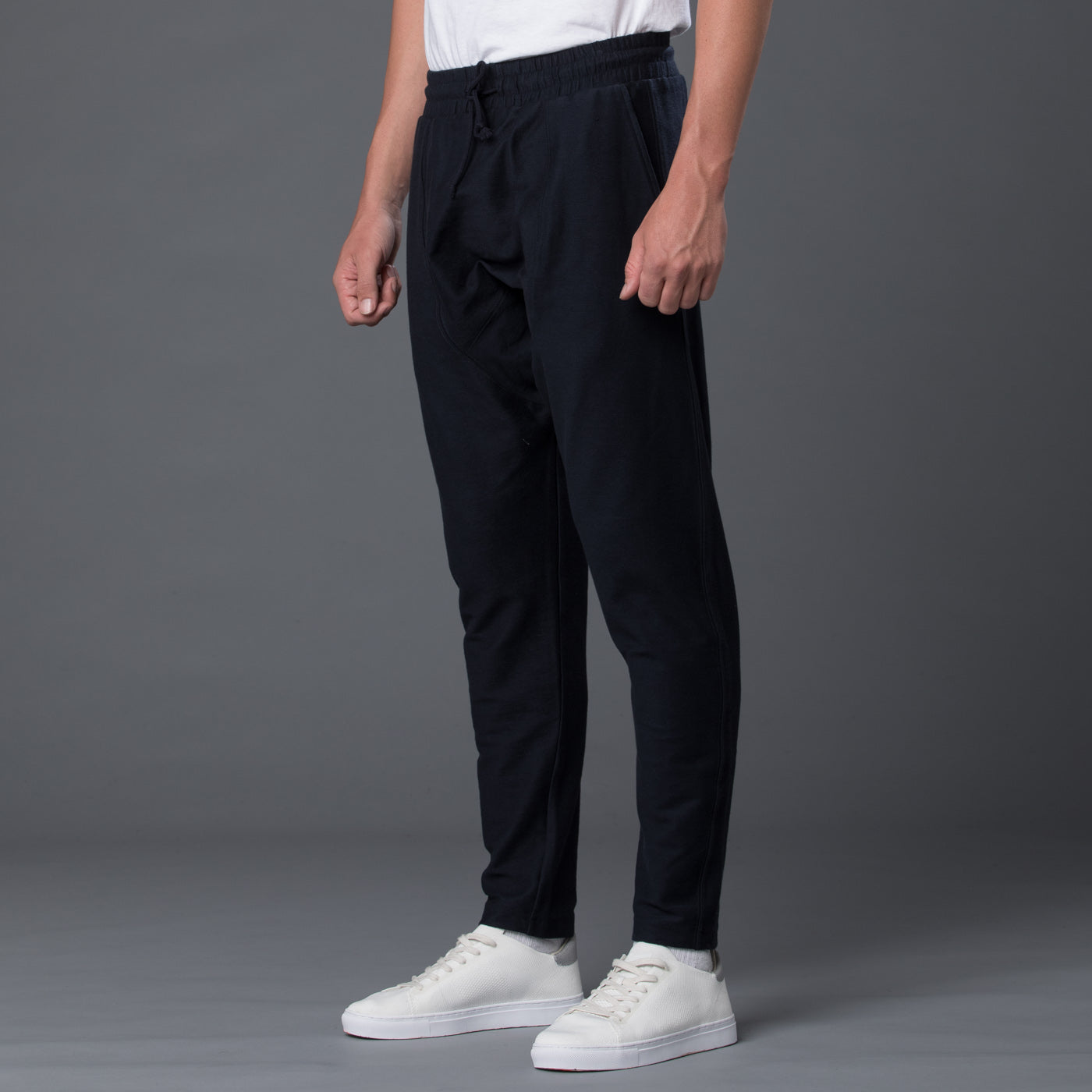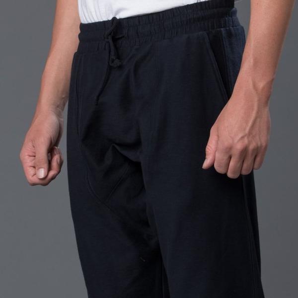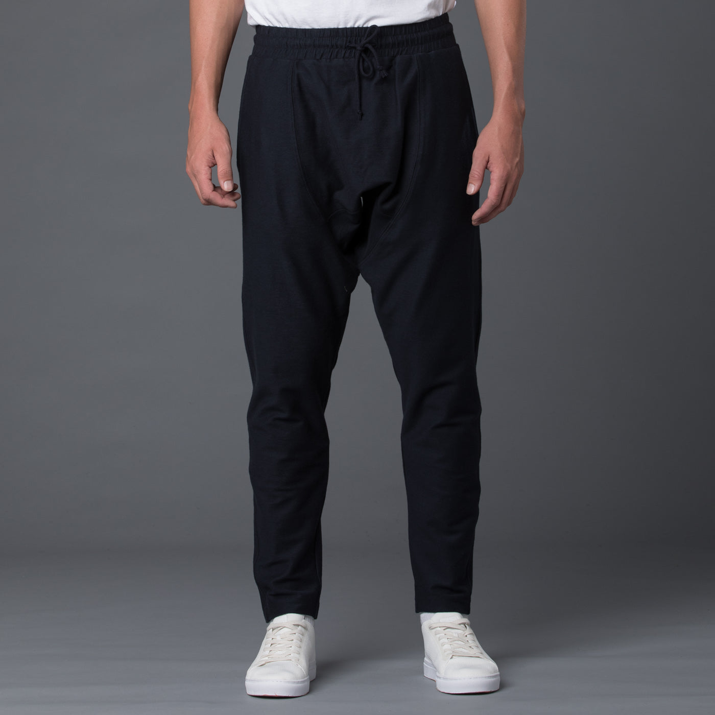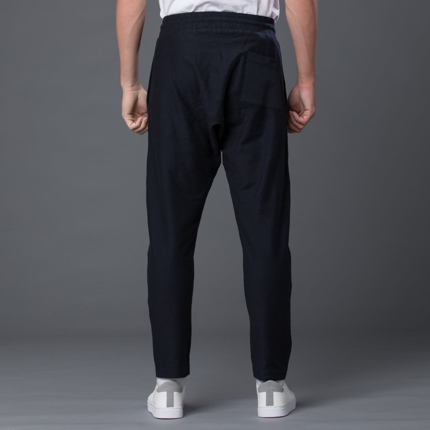 - Drop crotch. Slanted side seam pocket. Single back patch pocket. Elastic waistband w/ drawcord