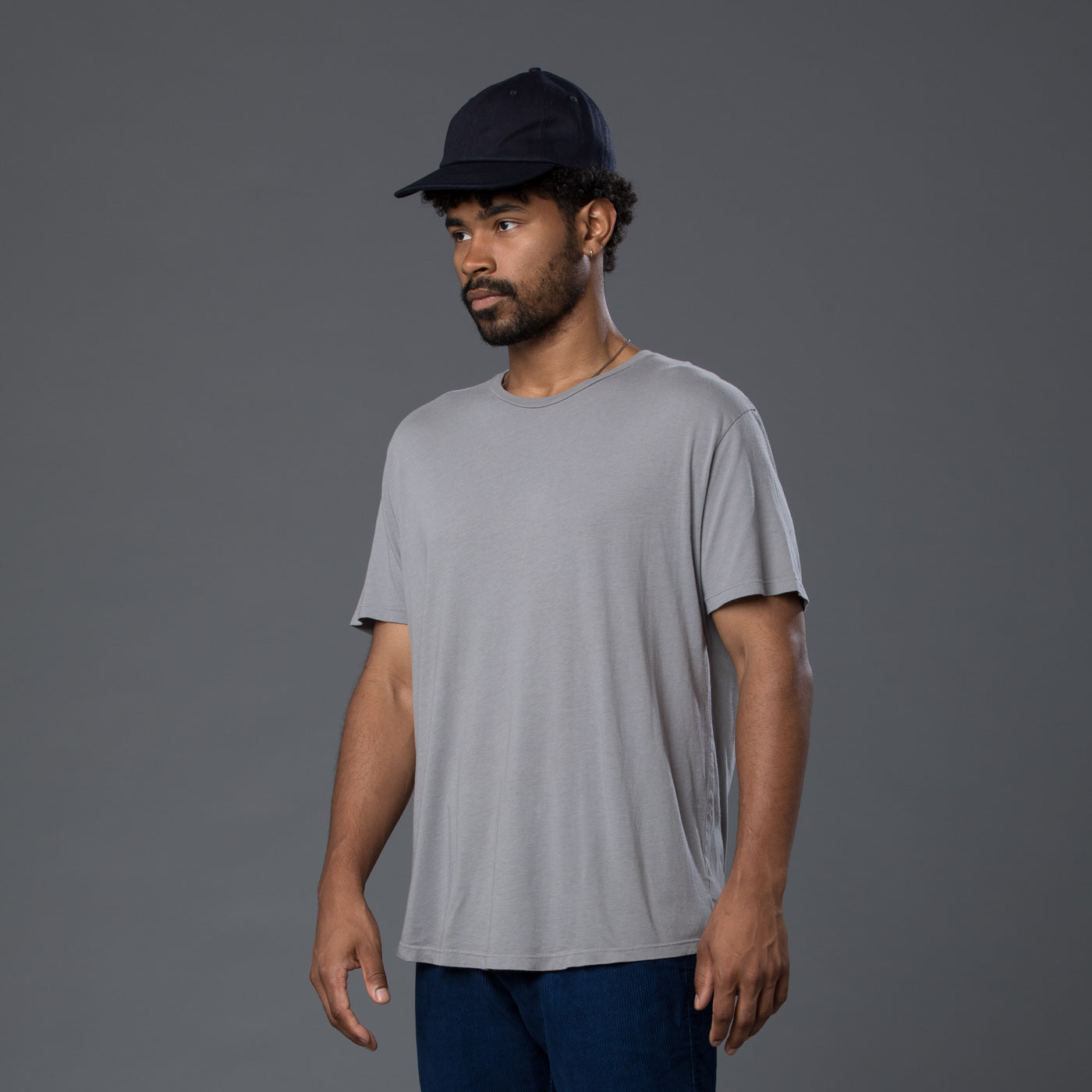 GREI NY design with comfort and ease in mind, and their Pigment Crewneck Tee is a reflection of their aesthetic. The tees are hand dyed in Brooklyn, and are created in butter soft supima cotton and micro modal blend. The process provided a color of depth and soft hand due to the dye process. With a relaxed fit and rounded hem, the tee is easy to dress up or down. Worn with the FREEMANS Easy Trouser and Indigo Cap.