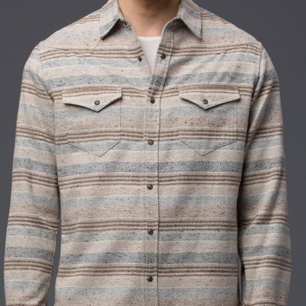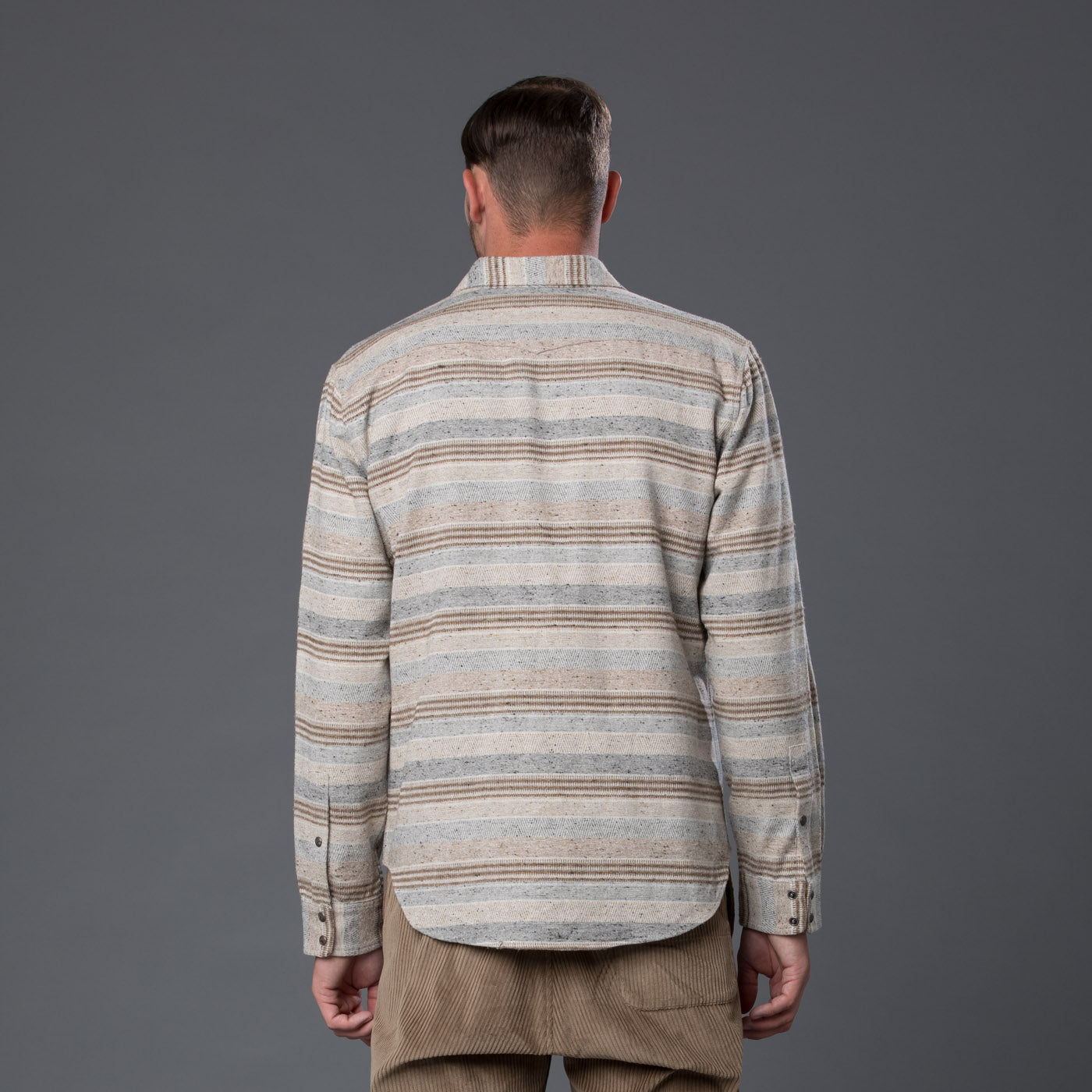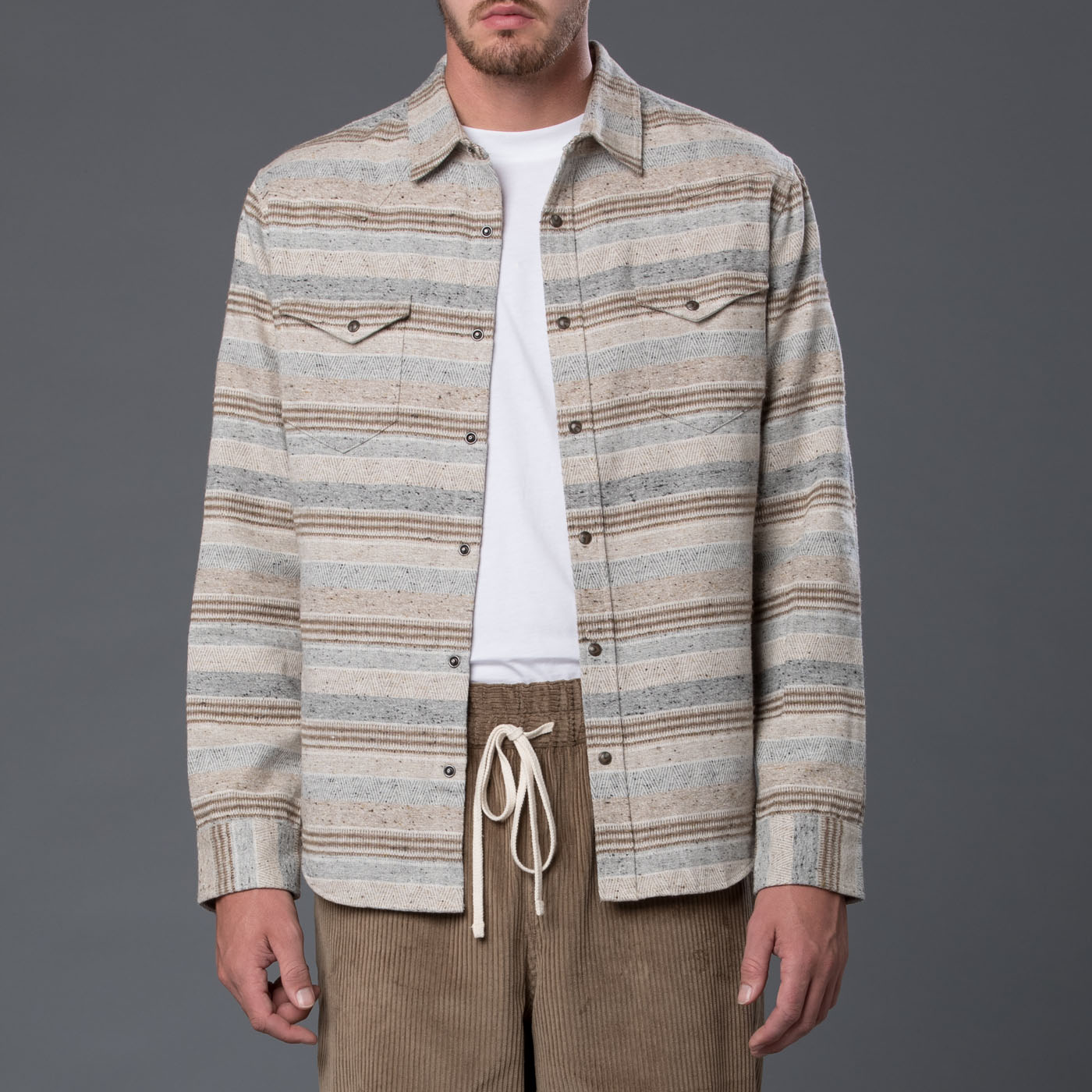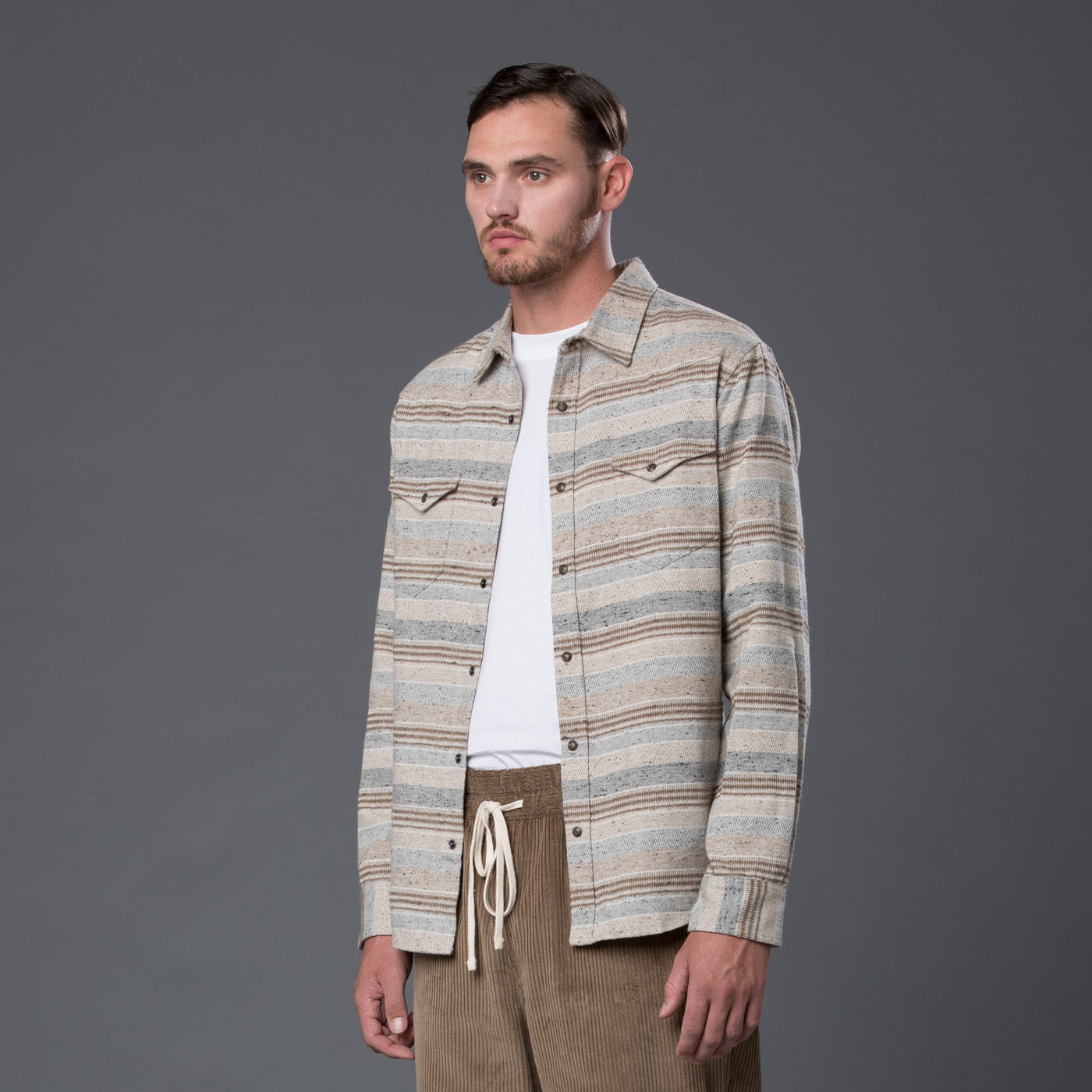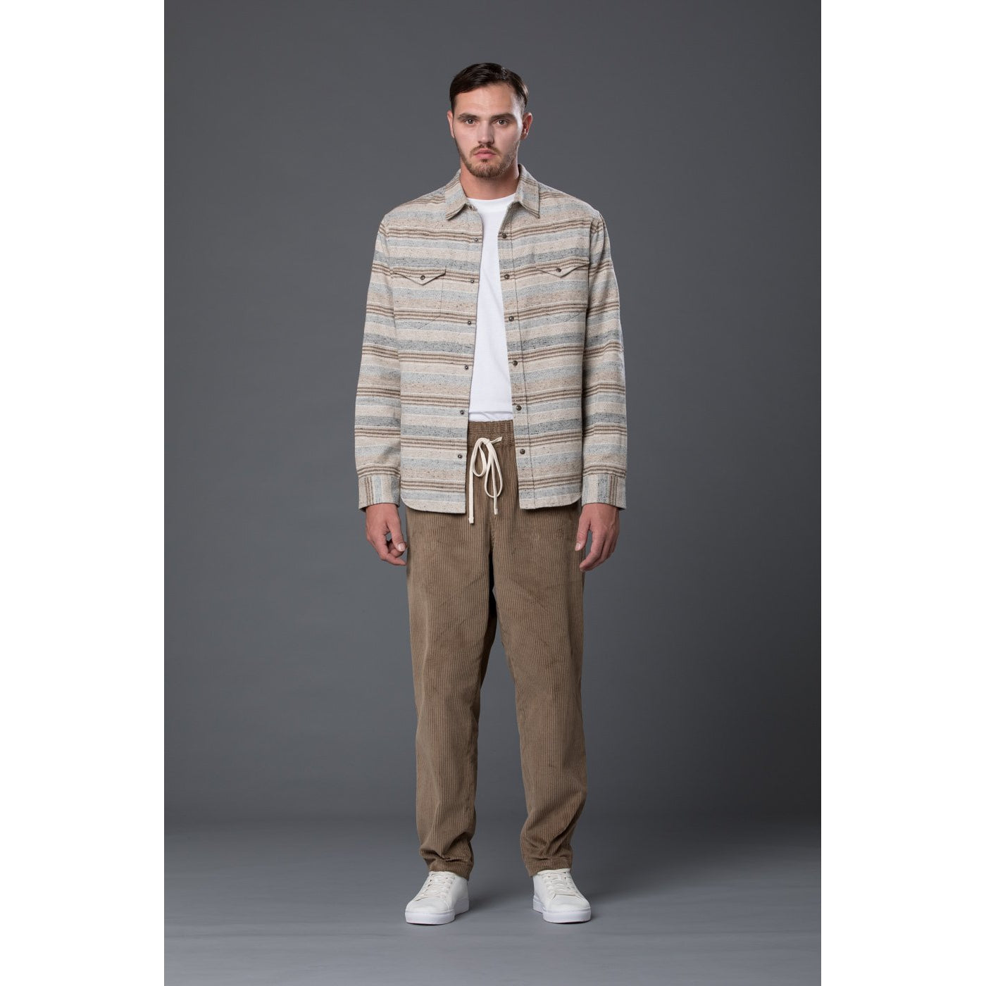 Straight from their great men's presentation, which referenced 80's youth subcultures, Krammer & Stoudt's Western Shirts were a constant theme throughout their new collection. Cut in a textured yarn dye flannel, the Wayne shirts are cut slim, with light western accents. This shirt provides great detailing in a modern silhouette. Shown here with the DEATH TO TENNIS Fiction Tee & sk manor hill Coma Pant.