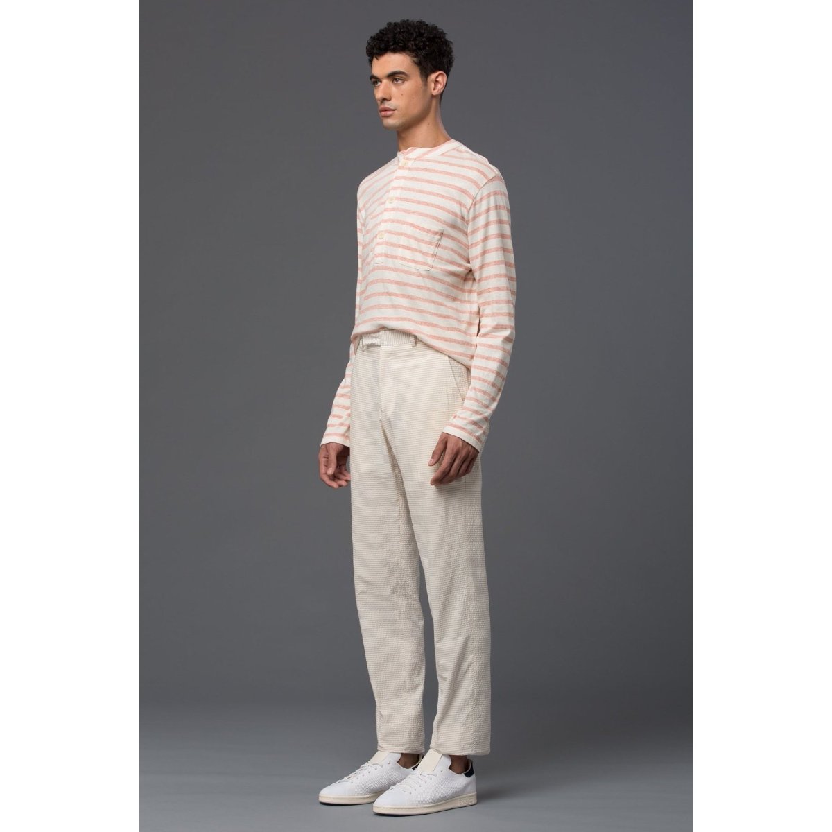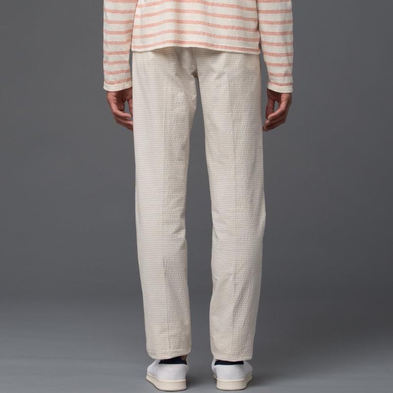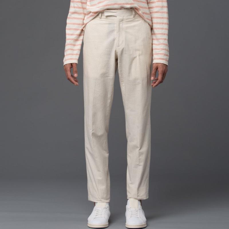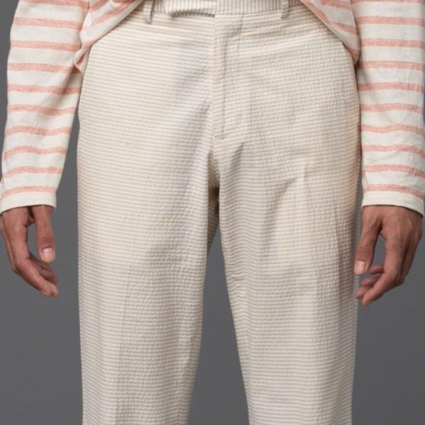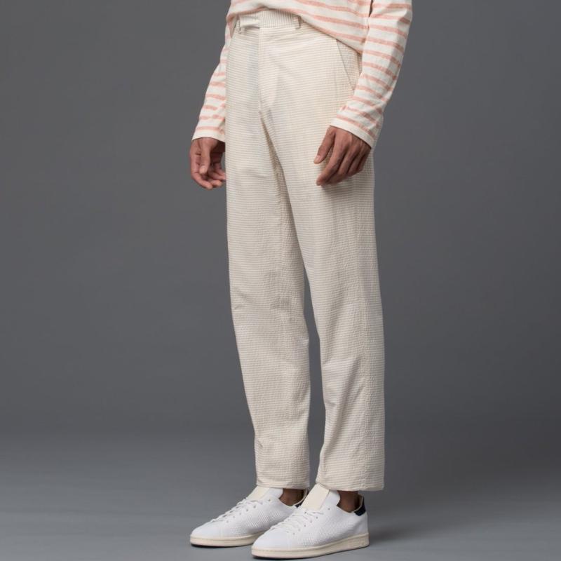 PALMIERS DU MAL's Como Trouser shows the brand's strong tailoring side and their design sensibility. Cut in a fitted modern silhouette, the brand does a new take on seersucker by cutting the stripes horizontally on the trouser. This simple tweak is enough to make the pants stand out in an understated way.
