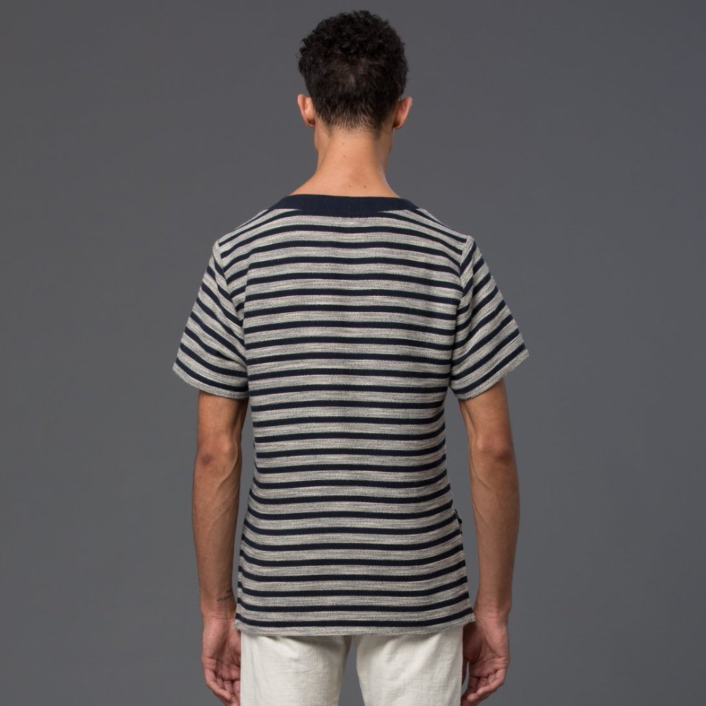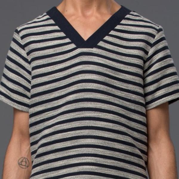 A more subtle offering from Thaddeus O'Neil, this V-Neck Top will definitely catch eyes due to its boxy structure, and the jacquard like weave of the fabric. With a navy blue contrast fabric at neckline, this piece will complement a casual jean, or for the bold, pair with the matching Striped Beach Short.