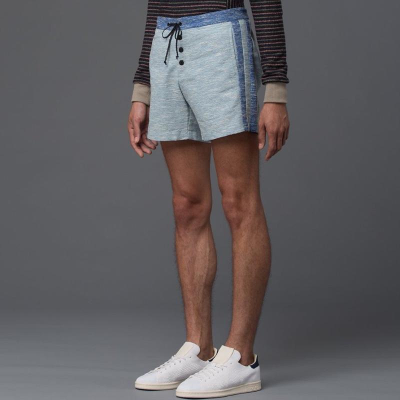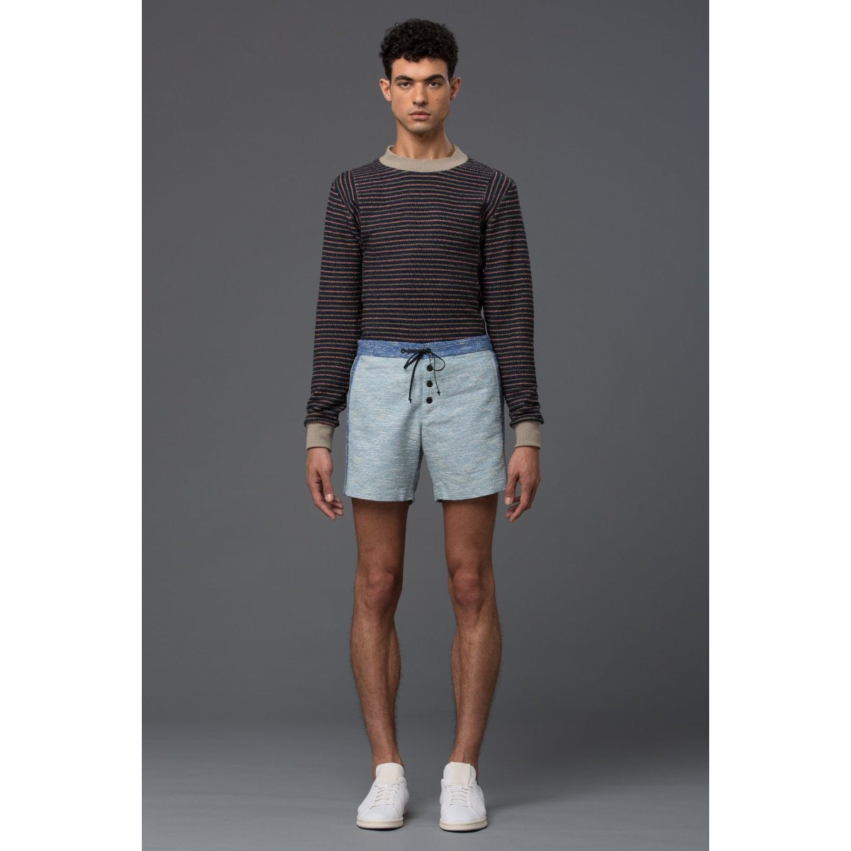 The Textured Board Shorts from Thaddeus O'Neil are a vibrant and cool mix of color and fabric texture. Cut slim and short, these shorts are perfect for a day out in warmer climates. The shorts can be matched with a nice soft luxurious tee, or as shown here with the Thaddeus O'Neil Striped Sweater.
